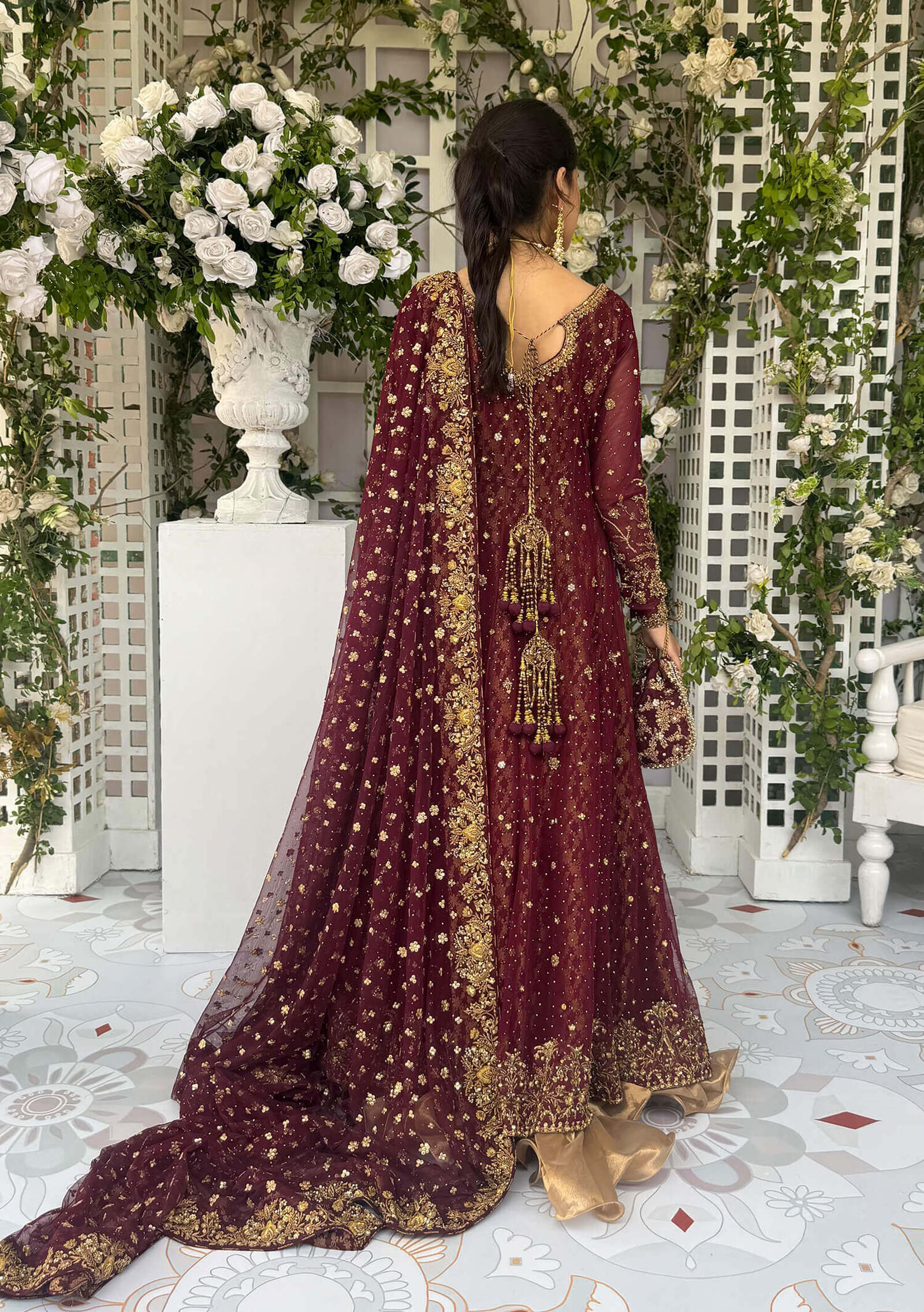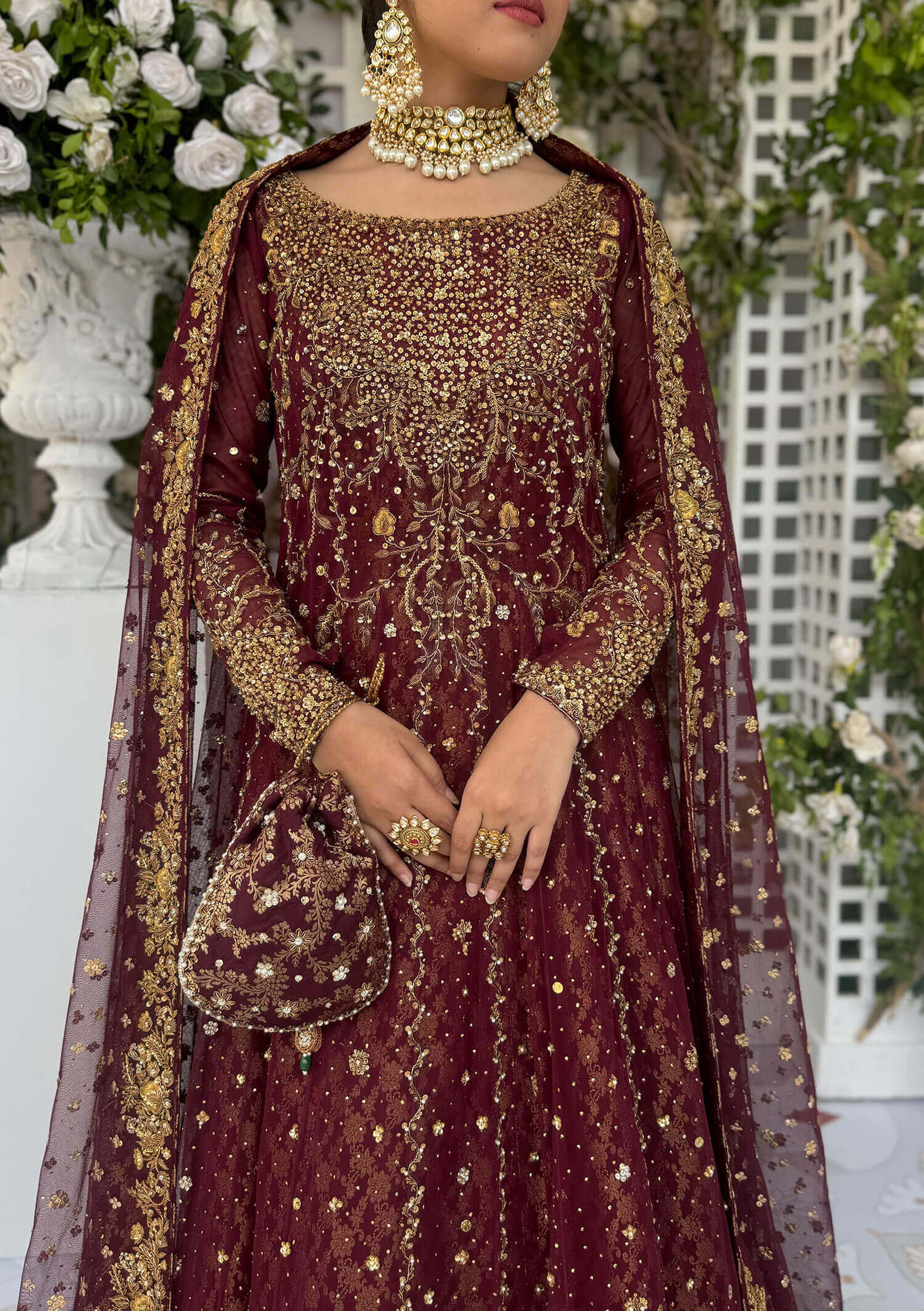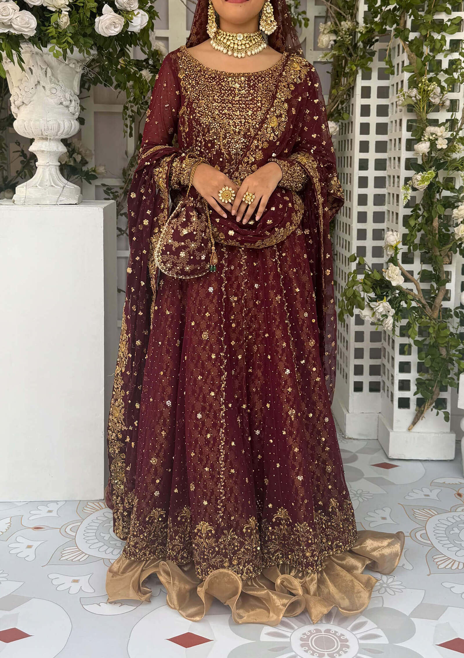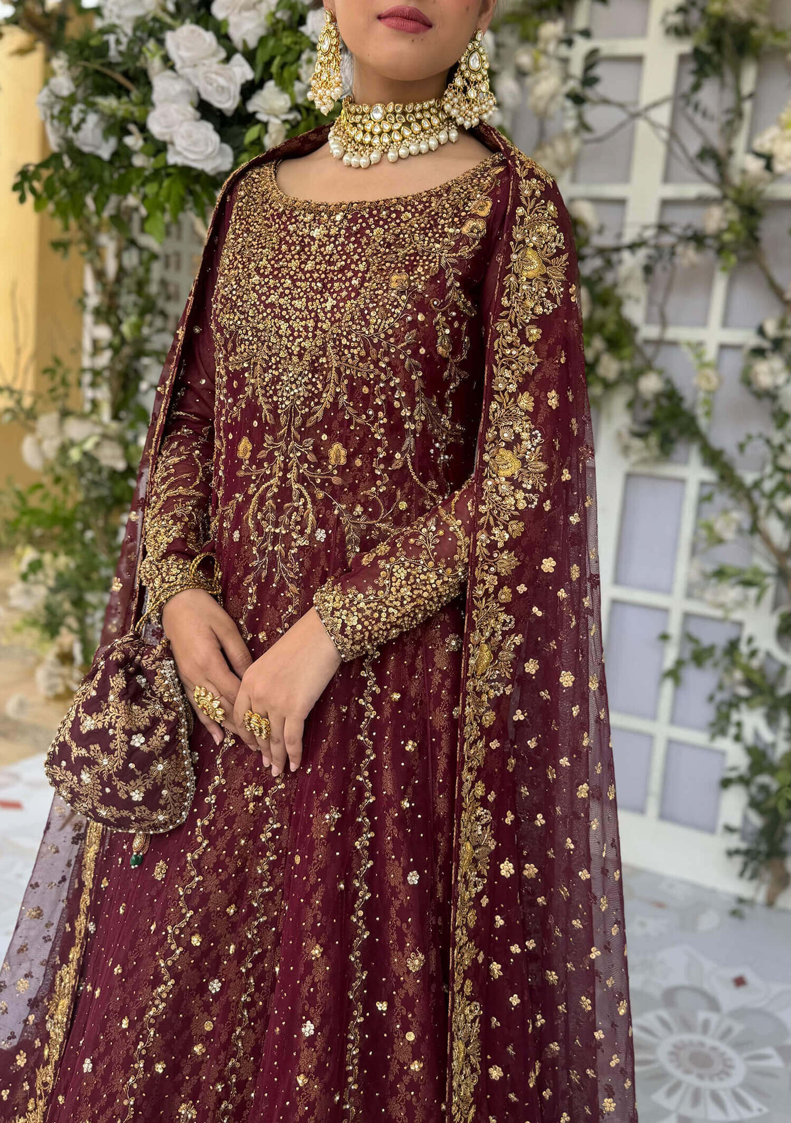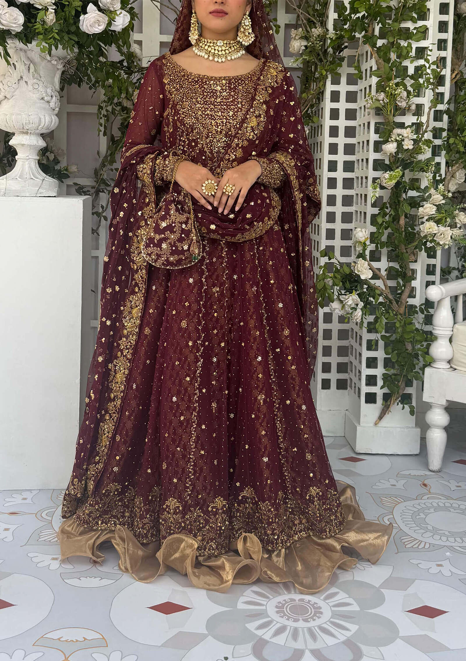 For the bride who dares to be different, Ashal brings. a contemporary twist to bridal couture. Crafted on french net in an elegant silhouette, it features a richly handworked hemline border, a detailed neckline and a captivating mix of spray work and kaamdani through the panels. Paired with a flowing lehenga finished with a luxurious tissue border, this ensemble moves with grace. The look completed with a net dupatta edged in a lavish handworked border and adorned with delicate spray work, creating a bridal statement that blends modern charm with timeless craftsmanship.