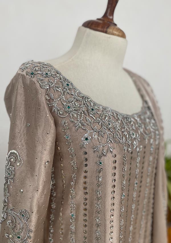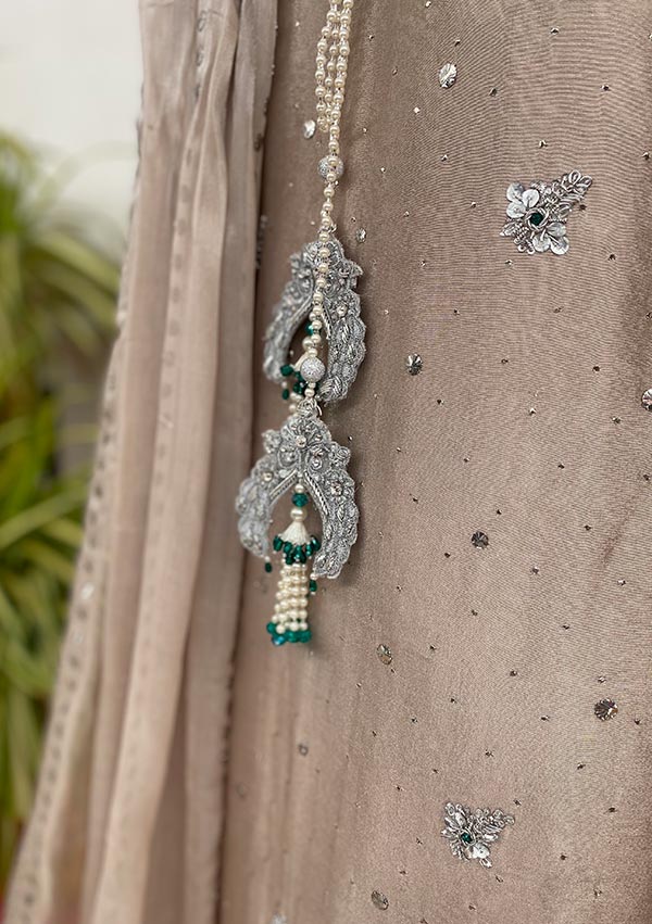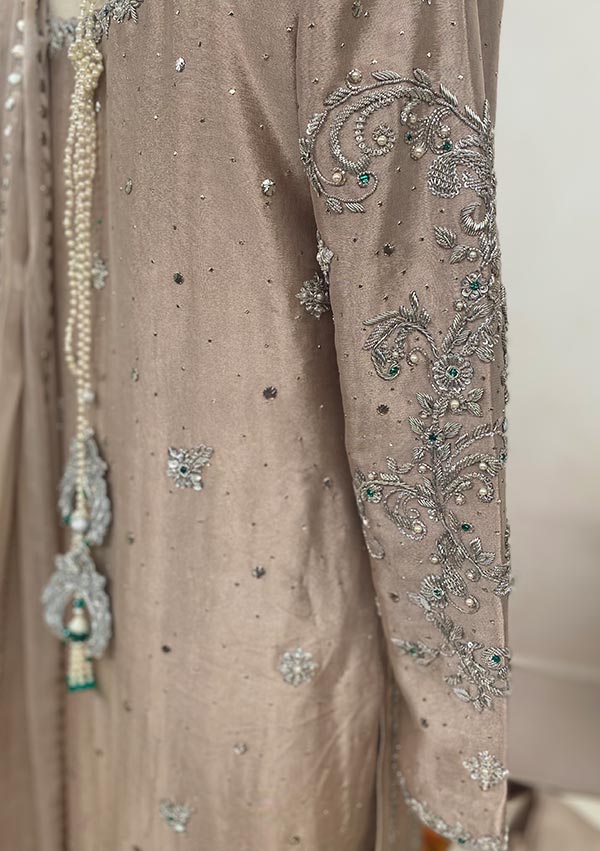 The perfect addition to your wardrobe with dapka worked and kamdani lines, delicate dapka handwork infused with green stones on the neck and hemline. Worked tassels on the back neckline and beautiful heavy embellished sleeves gives this outfit that complete look.