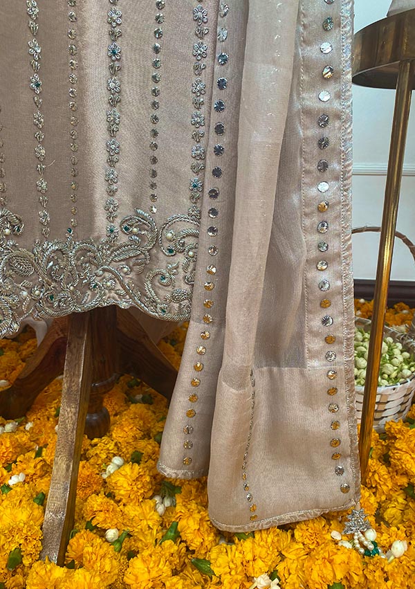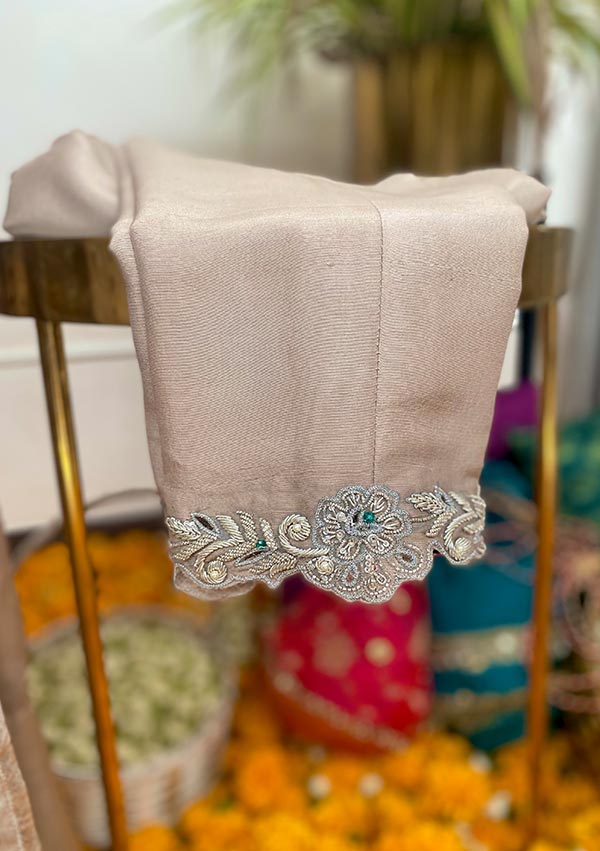 This outfit is paired with worked rawsilk pants and kamdani worked chiffon maysuri dupatta