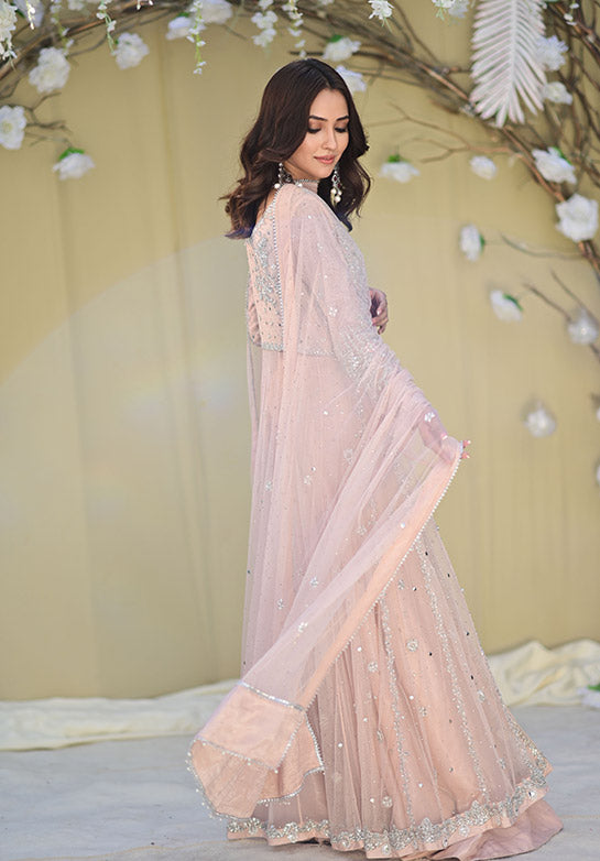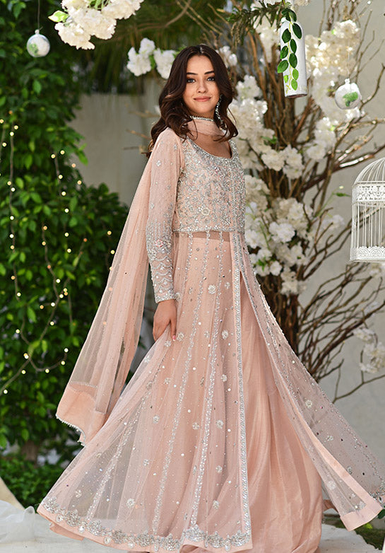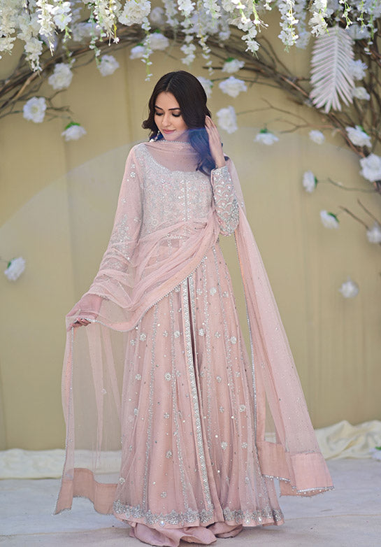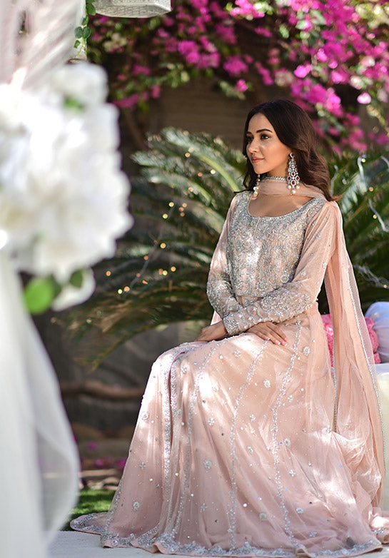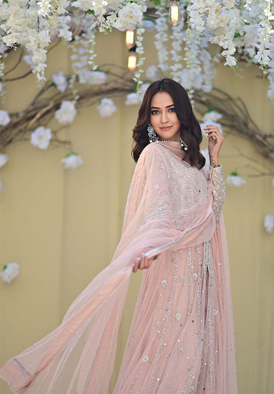 Zaynah is our beautiful and intricately worked kalidaar with timeless handwork techniques and resham details, along with a flare which is sure to make you twirl. It’s paired with our maysuri flared dhaka for a formal look.