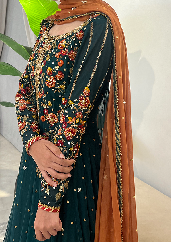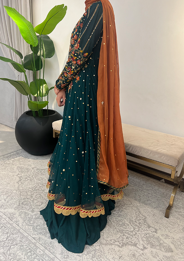 Perfect for your mehndi and other festive events. Curated on a beautiful teal net, this outfit offers a an array of festive color embroidered work on the neckline and sleeves couples with delicate kora and dapka work. Paired with a lehenga and a contrasting chiffon maysuri dupatta with trimmings