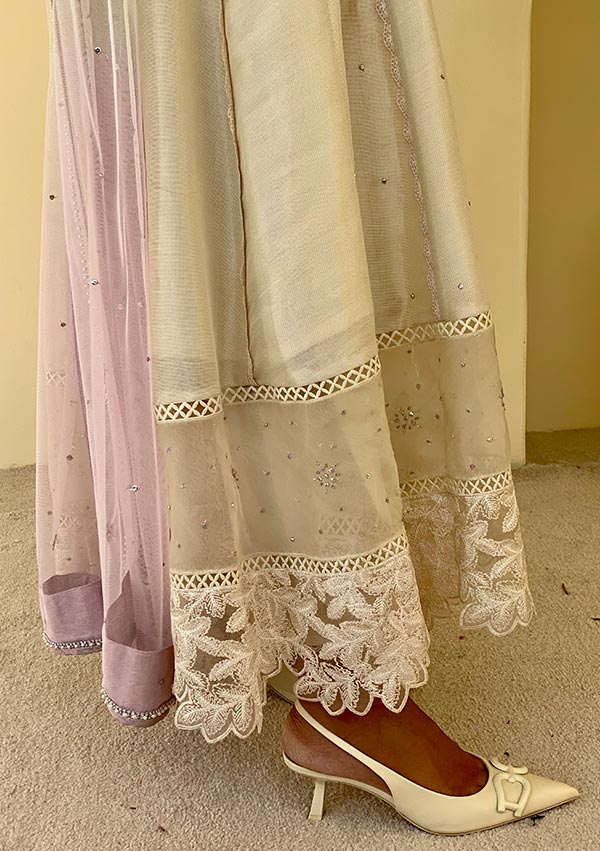 This ivory maysuri kalidaar is definite festive must have. Delicate handworked in coloured sequin, Katdaana and resham work on the neckline, beautiful sun spray on the organza hemline border and detailed sleeves. Paired with straight pants and an ombre net dupatta with sequin spray and festive finishings.