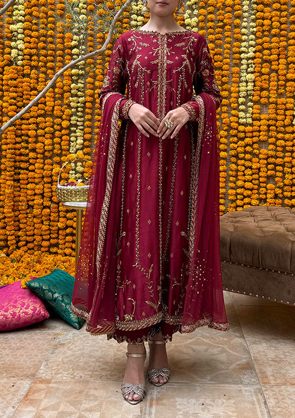 Searching for a classic fit? Look no further! Shermeen striked the perfect balance between traditional and contemporary. A traditional, forever favourite color in a straight, universally flattering silhouette coupled with contemporary work patterns and motifs. Paired with Handworked Pure Rawsilk izaar pants and a matching net dupatta with tilla borders and finishihngs.