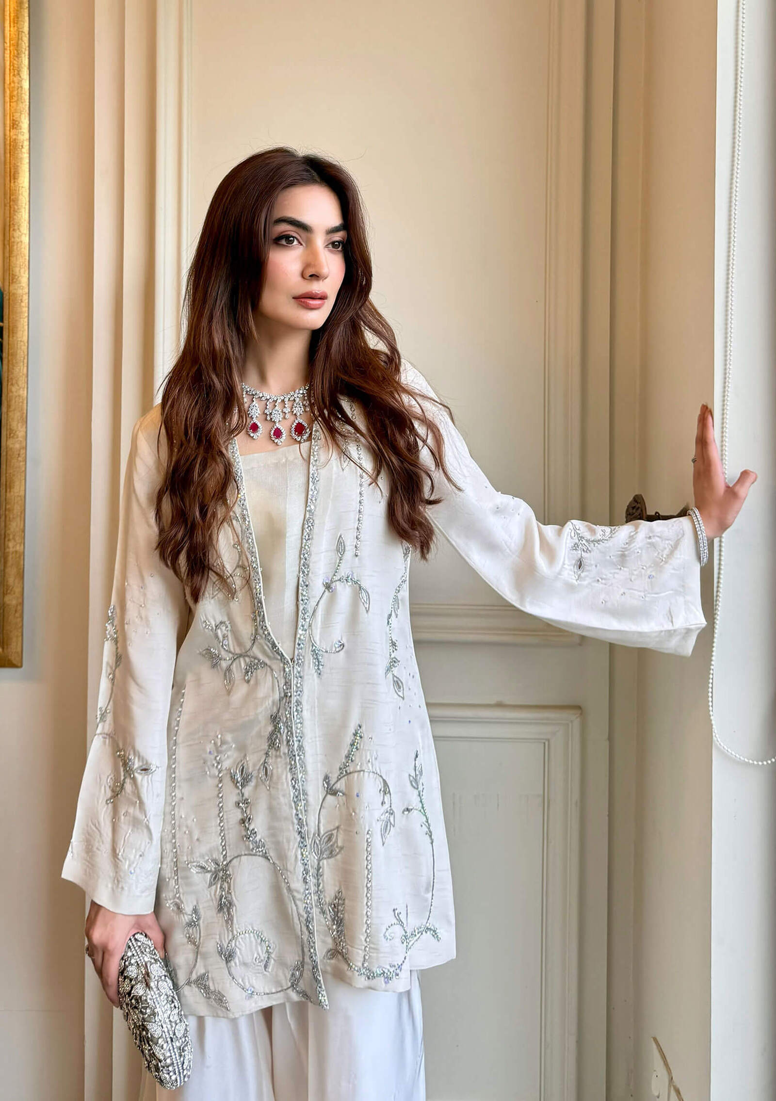Bold yet versatile, Our Vera Jacket is here to set the tone! This statement handworked jacket is a true head-turner. Wear it front open or closed to suit your mood. Paired with silk flared silk pants that fall in a dreamy fit. This ensemble blends contemporary edge with timeless elegance.