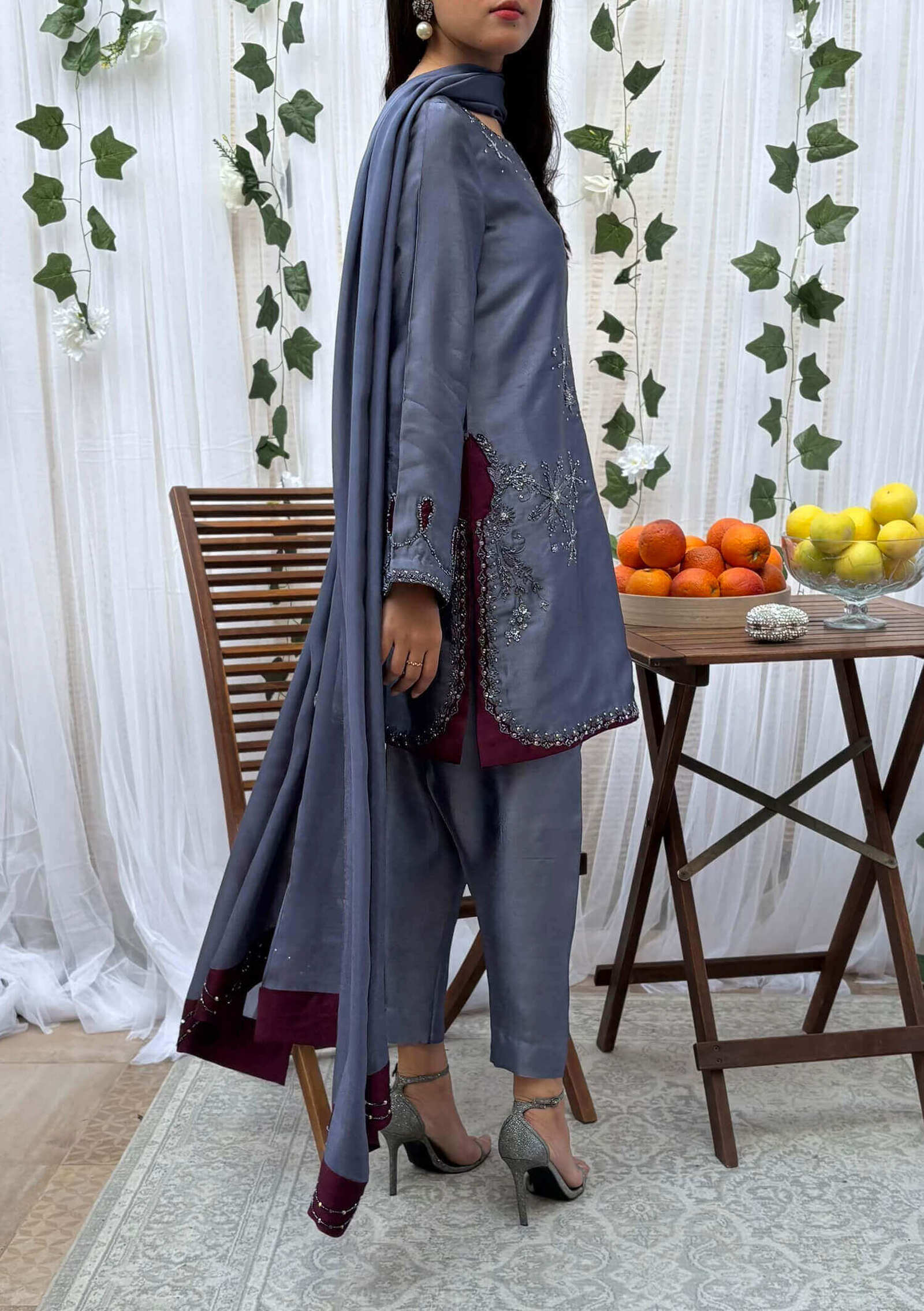 Designed in a modern short silhouette, this ensemble is elevated with detailed handwork in sequins, katdaana, and beads on deep burgundy appliqué across the chaak, daaman, and sleeves. Paired with a straight shalwar and a matching dupatta with handworked borders, this outfit ensures a refined yet statement presence.