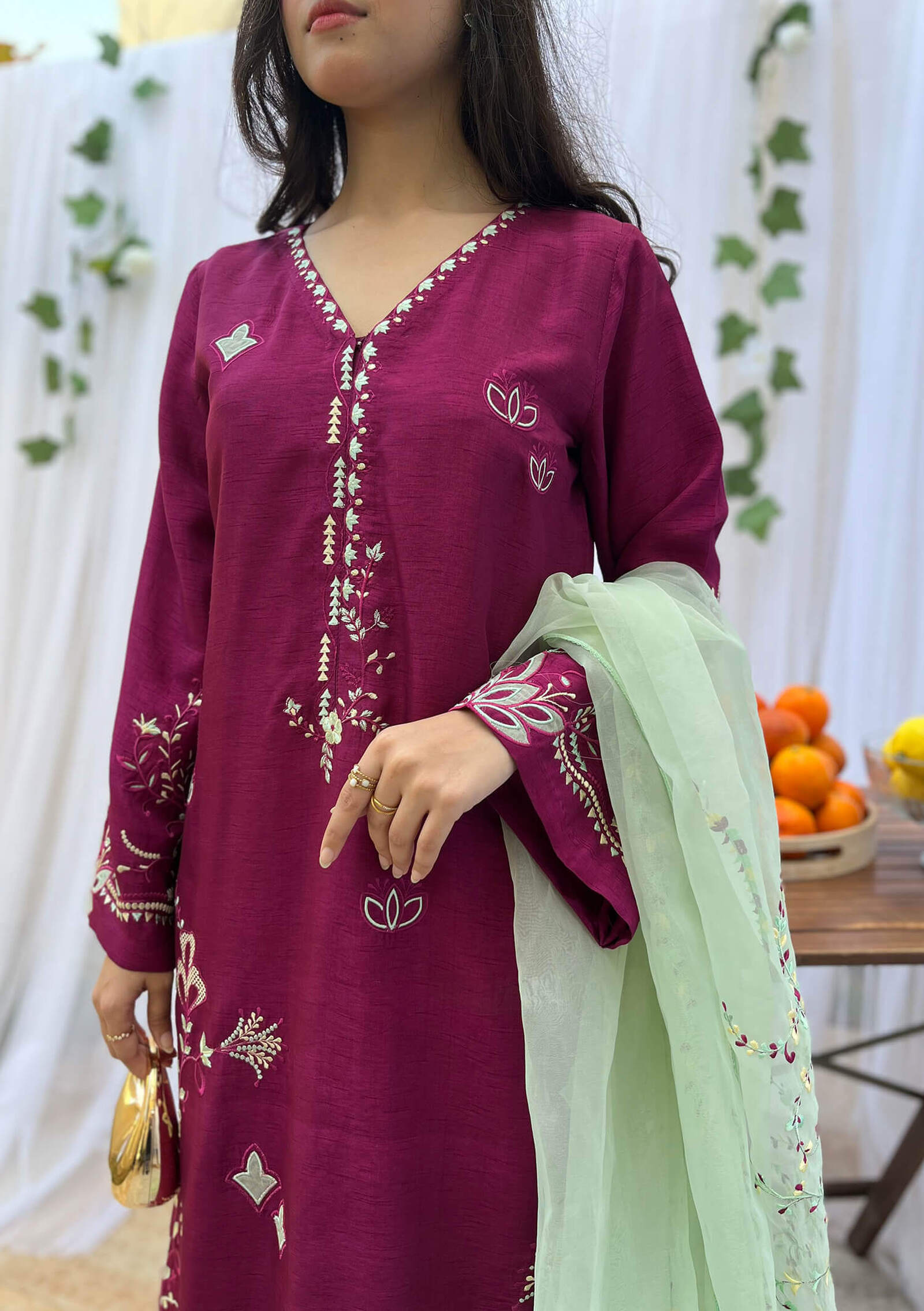 Rendered in a deep magenta hue, Mila is crafted on Korean raw silk in a softly structured straight silhouette with a gentle A-line fall. Resham embroideries in refreshing mint and magenta tones are balanced with mint appliqué work across the front, back, and sleeves. Paired with ivory izaar pants adorned with delicate mirror work, and finished with a contrasting organza dupatta, richly embroidered to elevate the look.