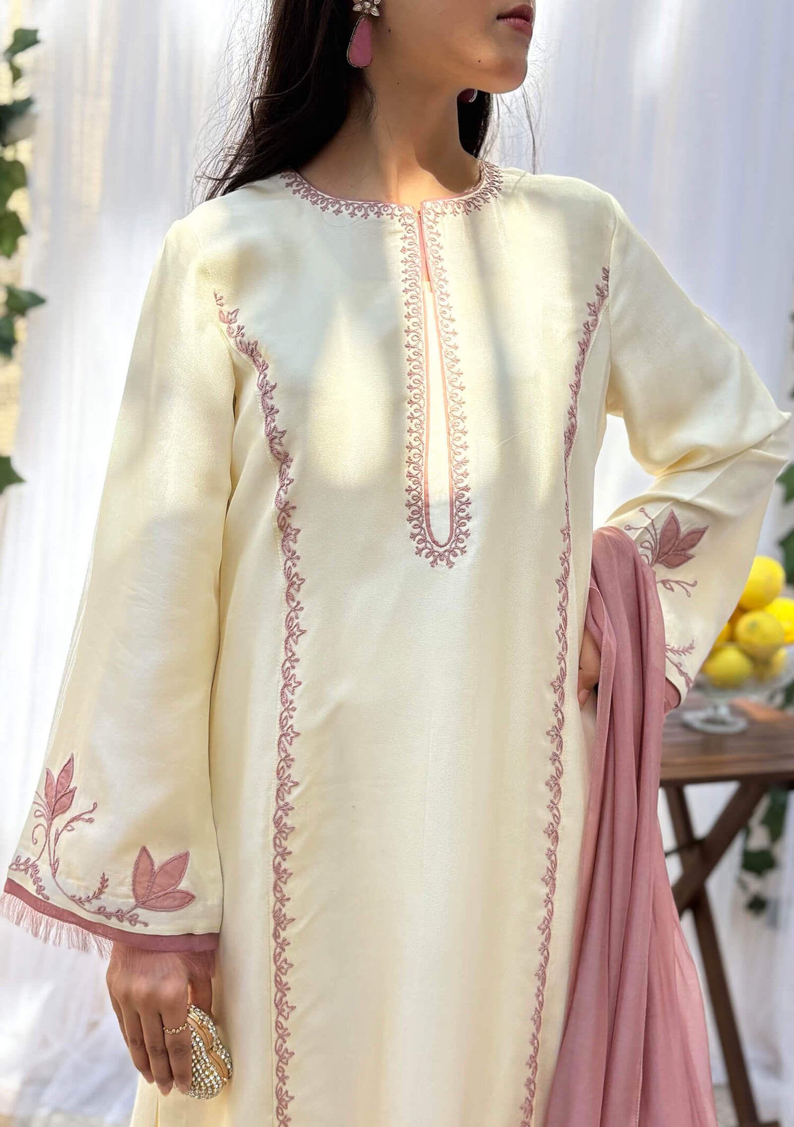 Crafted in soft butter sheesha silk, Pearl is cut in a beautifully flattering A-line silhouette, detailed with refined anchor work in a deep mauve hue. Finished with delicate mauve organza borders along the daaman and sleeves. Paired with Korean raw silk straight pants and a contrasting medium silk dupatta featuring a cutwork embroidered palloo. Graceful, elegant, and timeless.
