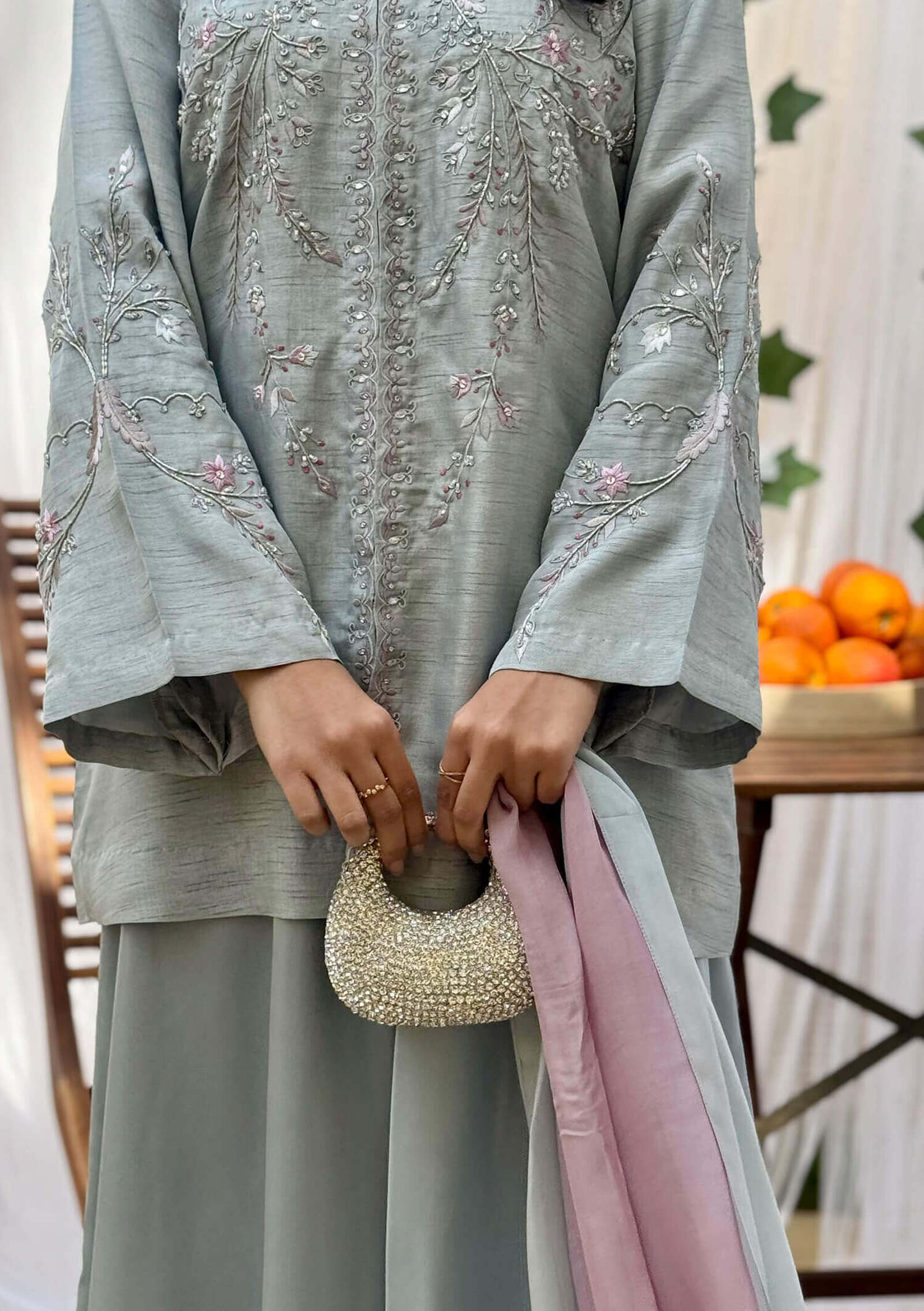 Rendered in the prettiest shade of ice blue, this statement jacket is accented with contrasting resham embroidery in soft lavender and blue hues, complemented by delicate handwork details. Designed in the season’s most coveted cut, it is paired with flared, free-flowing pants and an ombré medium silk dupatta—perfect for Eid and post-Eid festivities.