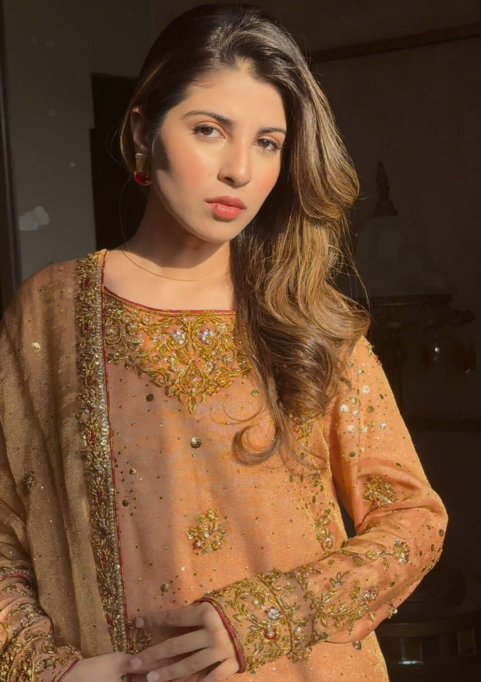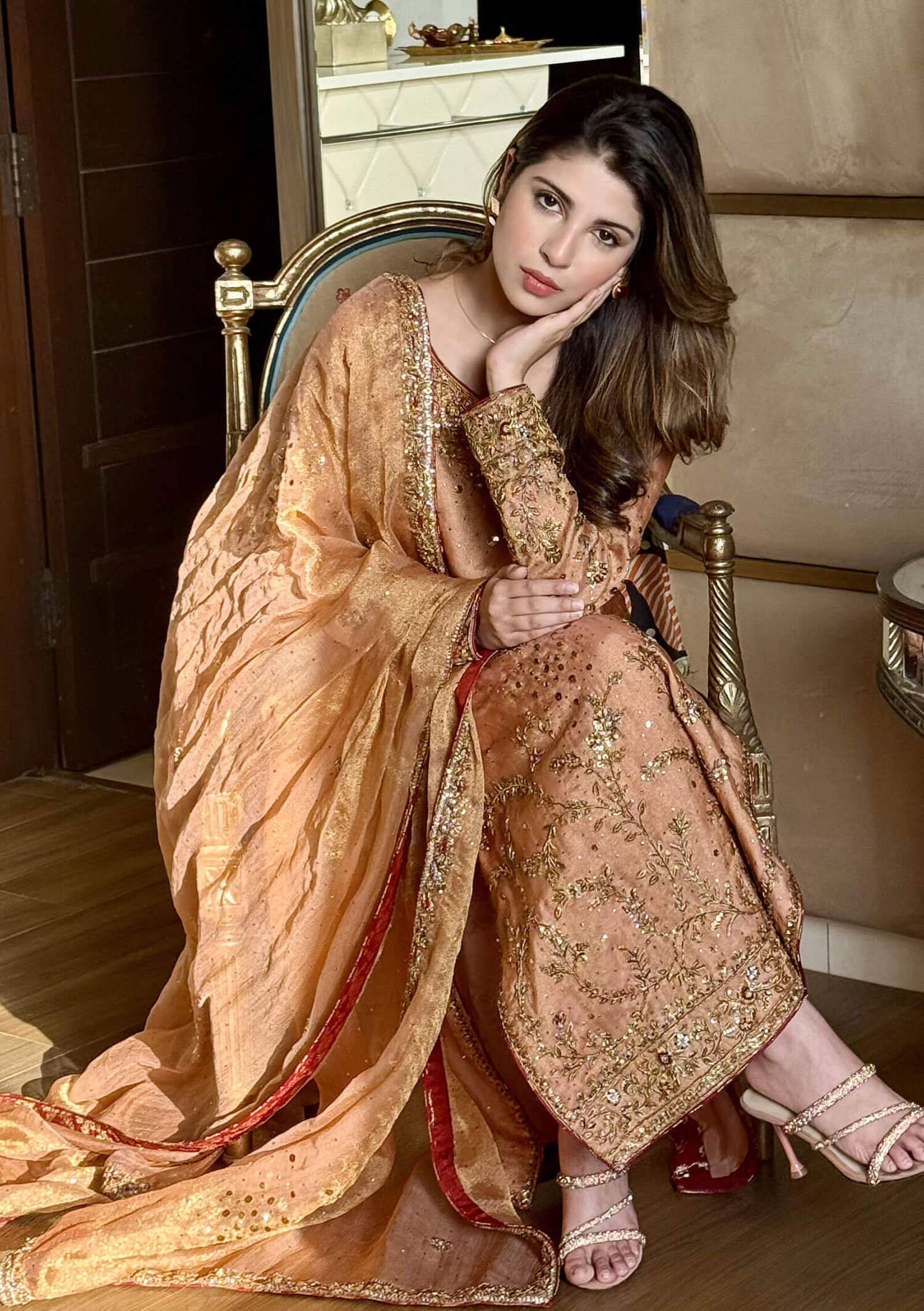 A timeless beauty in soft coral, Aelia is crafted on pure tissue net, showcasing exquisite dapka craftsmanship intertwined with maroon resham and rich kaamdani detailing. The look is elevated with in-house designed tassels that add a signature charm. Paired with straight pure raw silk pants and a matching tissue net dupatta adorned with four-sided handworked borders, this ensemble exudes traditional elegance with refined grace.