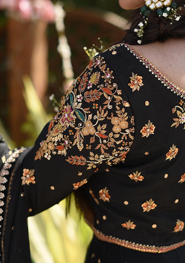 This beautifully worked choli is composed with an array of reshams, dapka and tilla work. A heavy sequinned, net lehenga and complimenting borders on the hemline and a net, sequinned dupatta with trimmings make this a perfect option for your festivities.