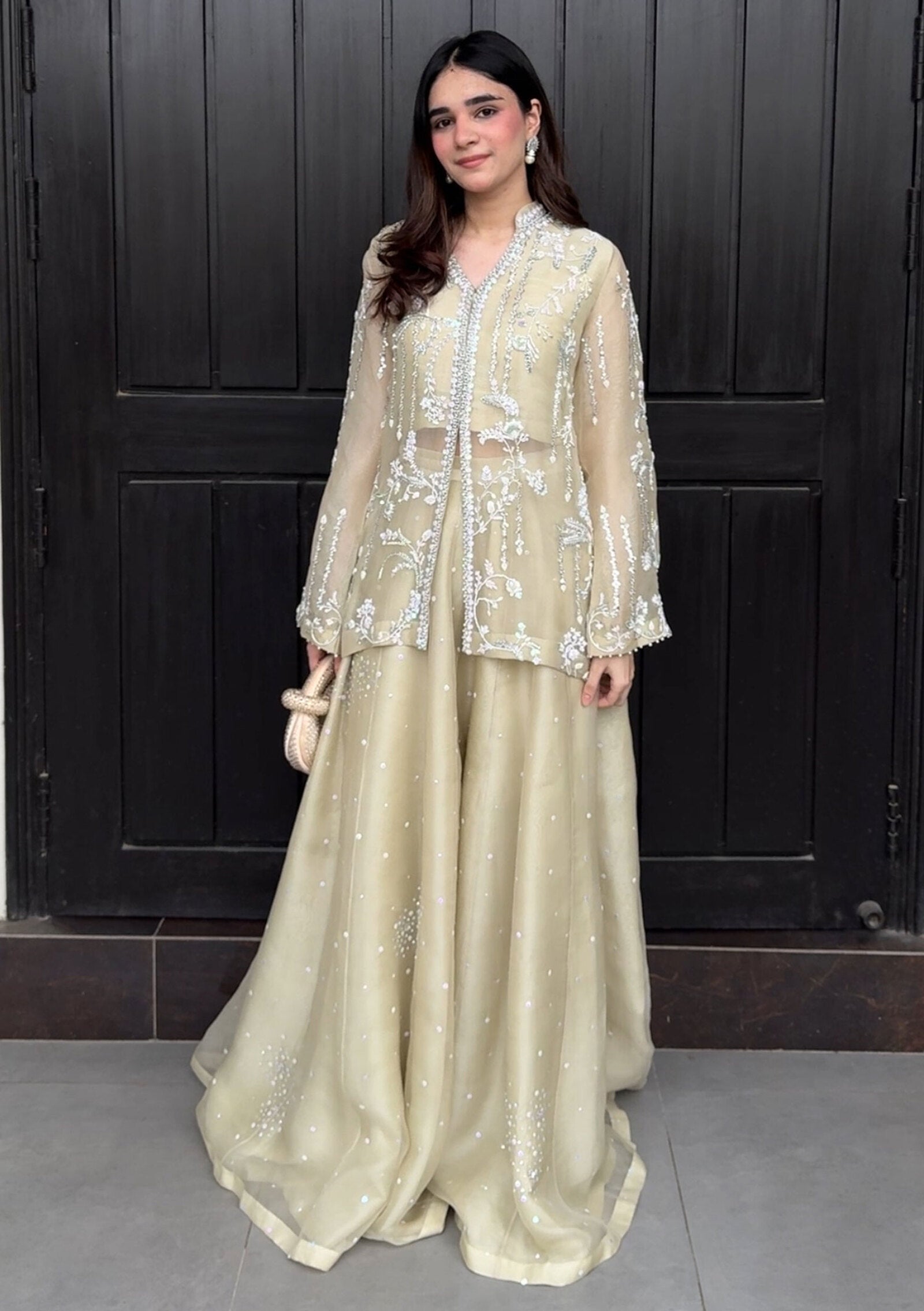 Fresh, Chic and effortessly elegant — Alisha is a short, stylish jacket in an ethereal kiwi mint hue that feels like a breath of spring. Crafted from the softest pure organza from the jacket to the graceful flared pants also made from pure organza for the dreamiest feel. Intricate heandwork of sequin, katdaana and dabka grace this outfit. Alisha is perfect for fashion-forward celebrations.
